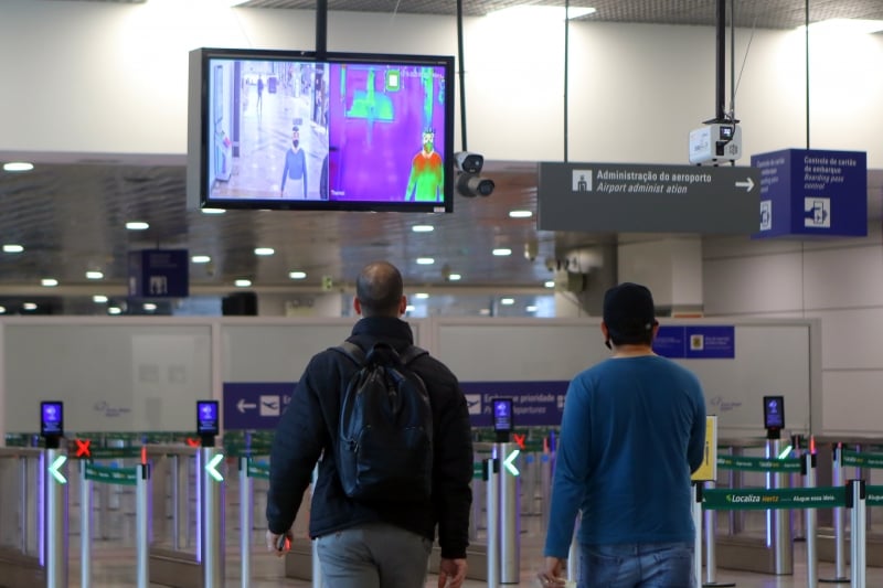 Passageiros passam por câmera que faz a aferição da temperatura antes de embarcar. Foto: Luiza Prado/JC