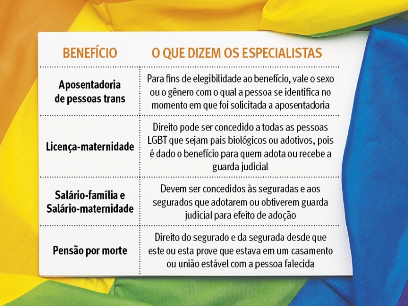 O advogado especialista em Direito Previdenciário e sócio do escritório Mauro Menezes & Advogados, Leandro Madureira, explica que todos os direitos trabalhistas e previdenciários devem ser garantidos, sem distinção de gênero ou orientação sexual, aos cidadãos LGBT, tal e qual são garantidos aos cidadãos cisgêneros e heterossexuais. "O fato de haver um relacionamento entre pessoas do mesmo sexo ou de um trabalhador se identificar como transexual não limita em nada o seu direito a um benefício ou a um direito. Logo, a eles também são garantidos os benefícios, desde que completem todos os requisitos exigidos pela legislação", afirma Madureira.