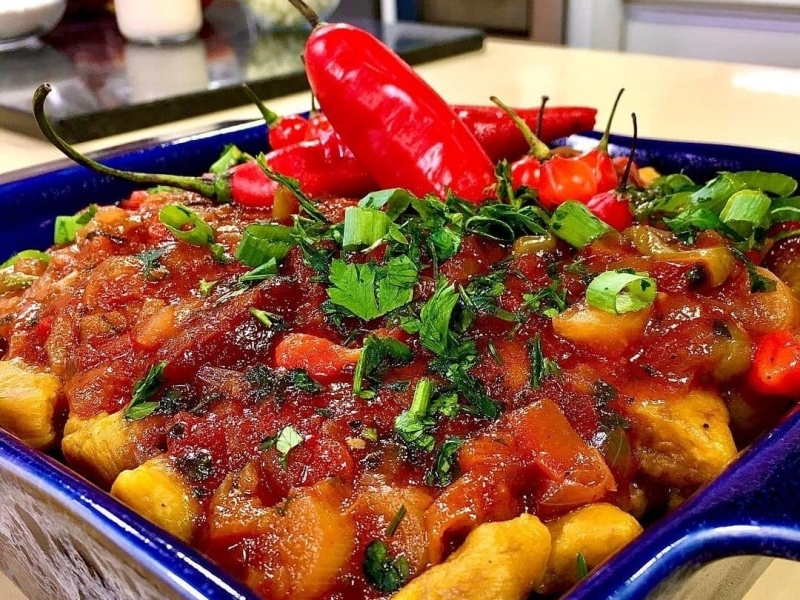 - Acrescentar pimenta cambuci cortada em tiras, geleia, extrato de tomate, goiabada, um pouco de água se necessário, sal e pimenta-do-reino.