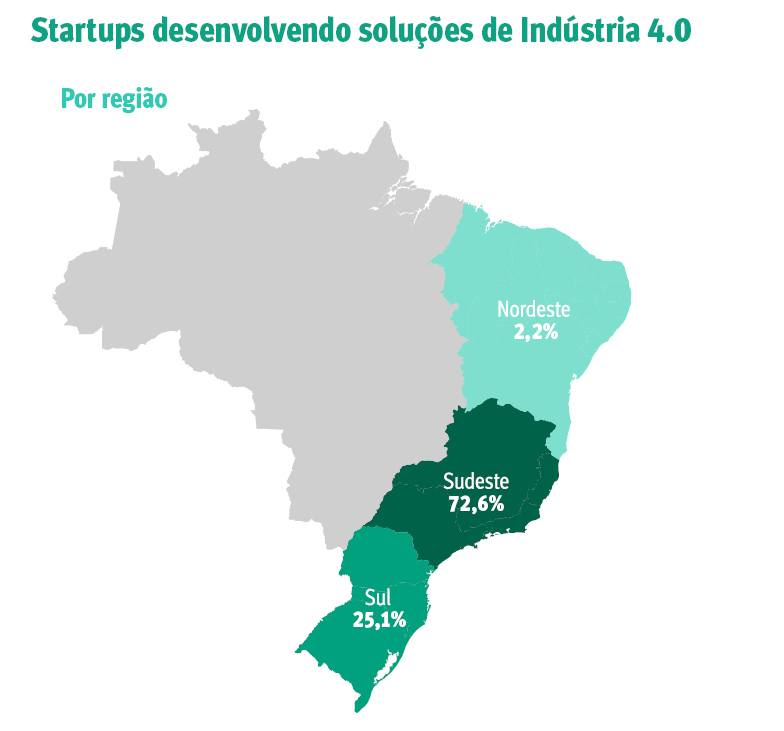 Este estudo foi feito com a LEAP, uma parceria da KPMG com a Distrito, e mostrou ainda que, quando se trata da presença de startups desenvolvendo soluções de Indústria 4.0, a região Sul está em segundo lugar no ranking das regiões, com um total de 25,1% do total, ficando atrás apenas da Região Sudeste com 72,6%.