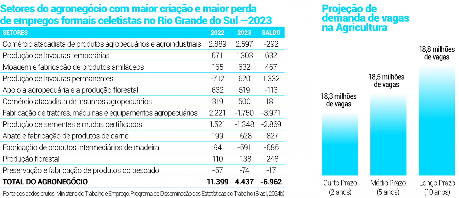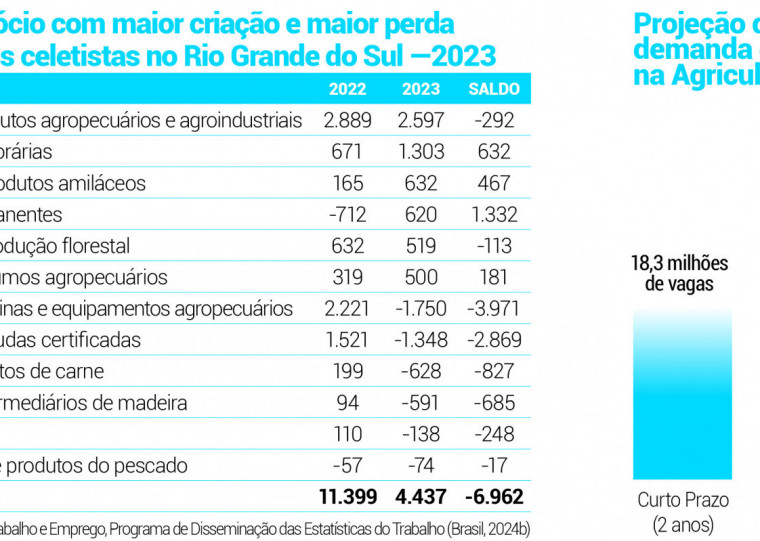 O professor coordenou uma pesquisa realizada pelo NEO/Ufrgs, em parceria com a Agência Alemã de Cooperação Internacional (GIZ) e o Serviço Nacional de Aprendizagem Industrial (Senai) prospectou que, entre 2021 e 2023, as oito novas carreiras ligadas ao agronegócio gerariam cerca de 178,8 mil oportunidades de trabalho, com apenas 32,5 mil profissionais qualificados para preenchê-las, ou seja, uma defasagem de 82%. "E essa tendência vem se confirmando até hoje, com base nas informações qualitativas do que a gente ouve no mercado. O gap de falta de profissionais só aumenta, com instituições que nem eram voltadas para o agro, como o Senai que vem olhando muito mais para o setor para a parte de tecnologia industrial, fazendo vários investimentos, justamente por essa necessidade de maior qualificação", afirma, responsável pelo estudo.
