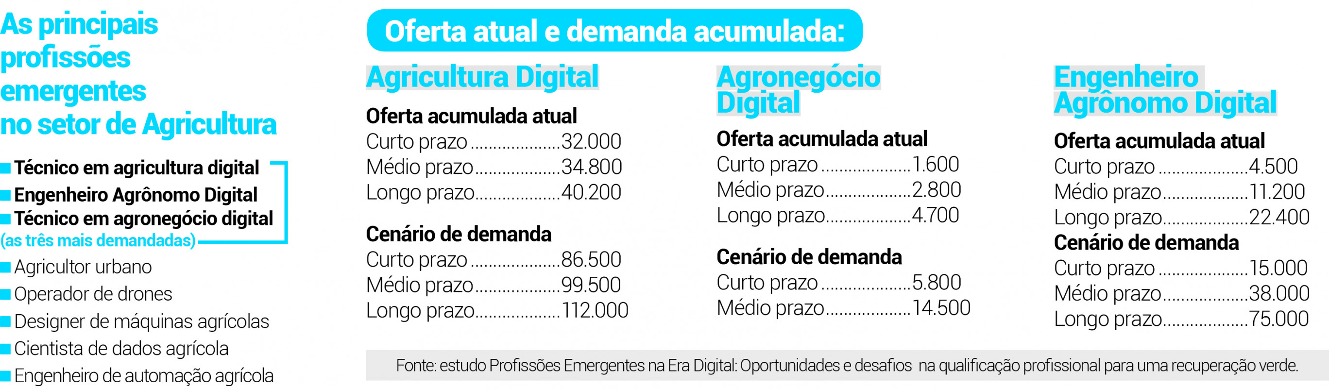 O trabalho intitulado Profissões Emergentes na Era Digital aponta que as novas profissões que estão ganhando destaque na agricultura são: técnico em agricultura digital, técnico em agronegócio digital, engenheiro agrônomo digital, operador de drones, agricultor urbano, engenheiro de automação agrícola, cientista de dados agrícola e designer de máquinas agrícolas.