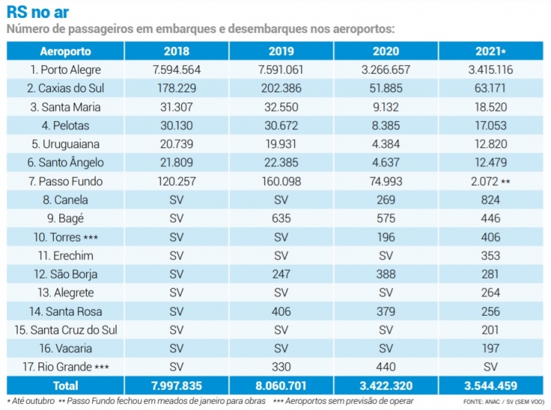 Em 2021, o Estado começou com 16 aeródromos ativos e termina com 14. Passo Fundo está fechado devido a obras. Torres não tem previsão de ter voos, e Rio Grande está fora do radar das companhias.