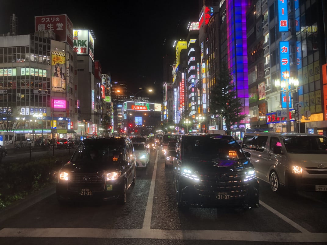 Multidões circulam à noite por bairros centrais de Tóquio com forte comércio e os tradicionais luminosos nos prédios. Eram 23h de domingo, e cruzamentos de Shinjuku estavam um formigueiro. Com segurança, transporte em metrô eficiente e atrações noturnas, uma multidão de jovens se diverte ao ar livre. Também nota-se a presença de turistas ocidentais.