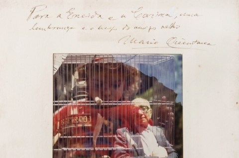 Trata-se de duas fotos misturadas, uma é da menina Carina, diante de uma gaiola com passarinho; a segunda aparece o poeta Mario Quintana, na rua, com pessoas caminhando. Aquele "erro" foi bem acolhido e até validado. Impresso está e apresenta a dedicatória do escritor querido, que associou a surpresa a um famoso poema.