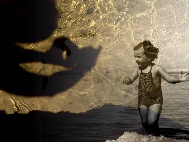 Autorretrato com uma foto da sua infância, na praia, e interação digital com clique de sua sombra