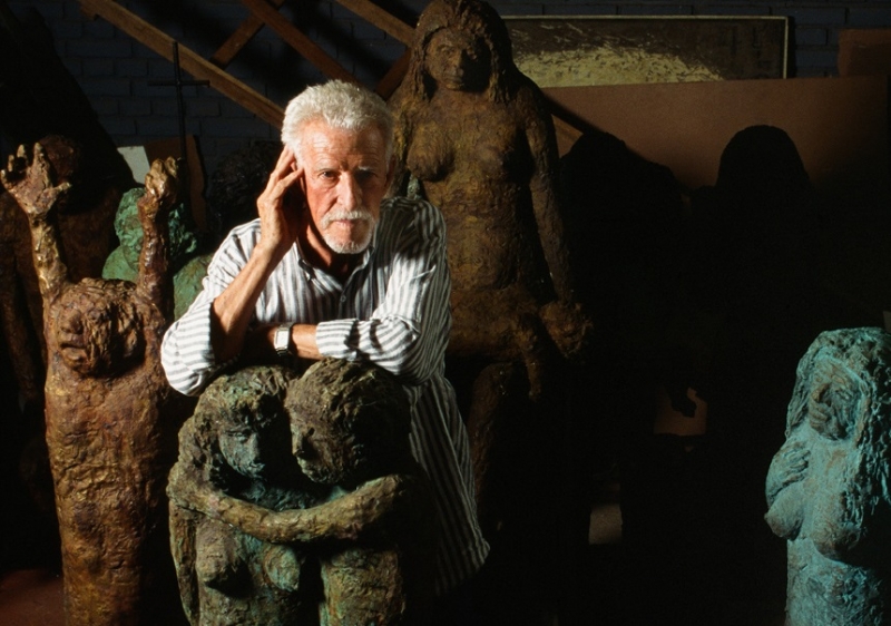 Em 1987, rodeado de suas esculturas da série Gabirus, o artista faz concha com as mãos para ouvir melhor.