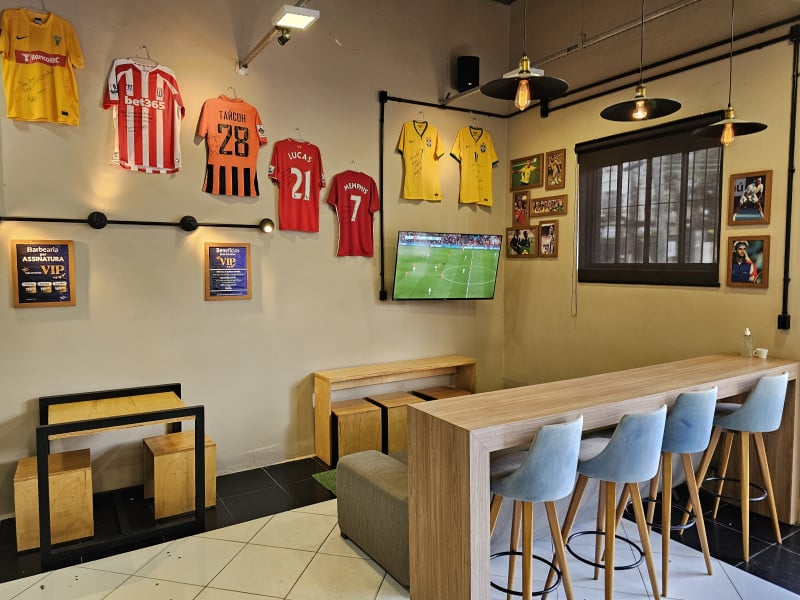 A Sports Barber possui áreas com televisão, sinuca, churrasqueira e chopeira, além de uma exposição de camisetas assinadas por ex-jogadores da dupla Grenal, como Douglas Costa, Taison e Lucas Leiva. Os atletas são clientes da academia Team Villeroy. O objetivo da decoração é o mesmo do serviço de assinatura: conseguir reter o público por um período maior dentro da barbearia, gerando curiosidade e identificação. “A ideia é vincular o serviço de corte e barba com diversão. Nosso objetivo é que o cliente possa vir com um amigo jogar uma sinuca, tomar um chope e cortar o cabelo, por exemplo”, diz Newmar.