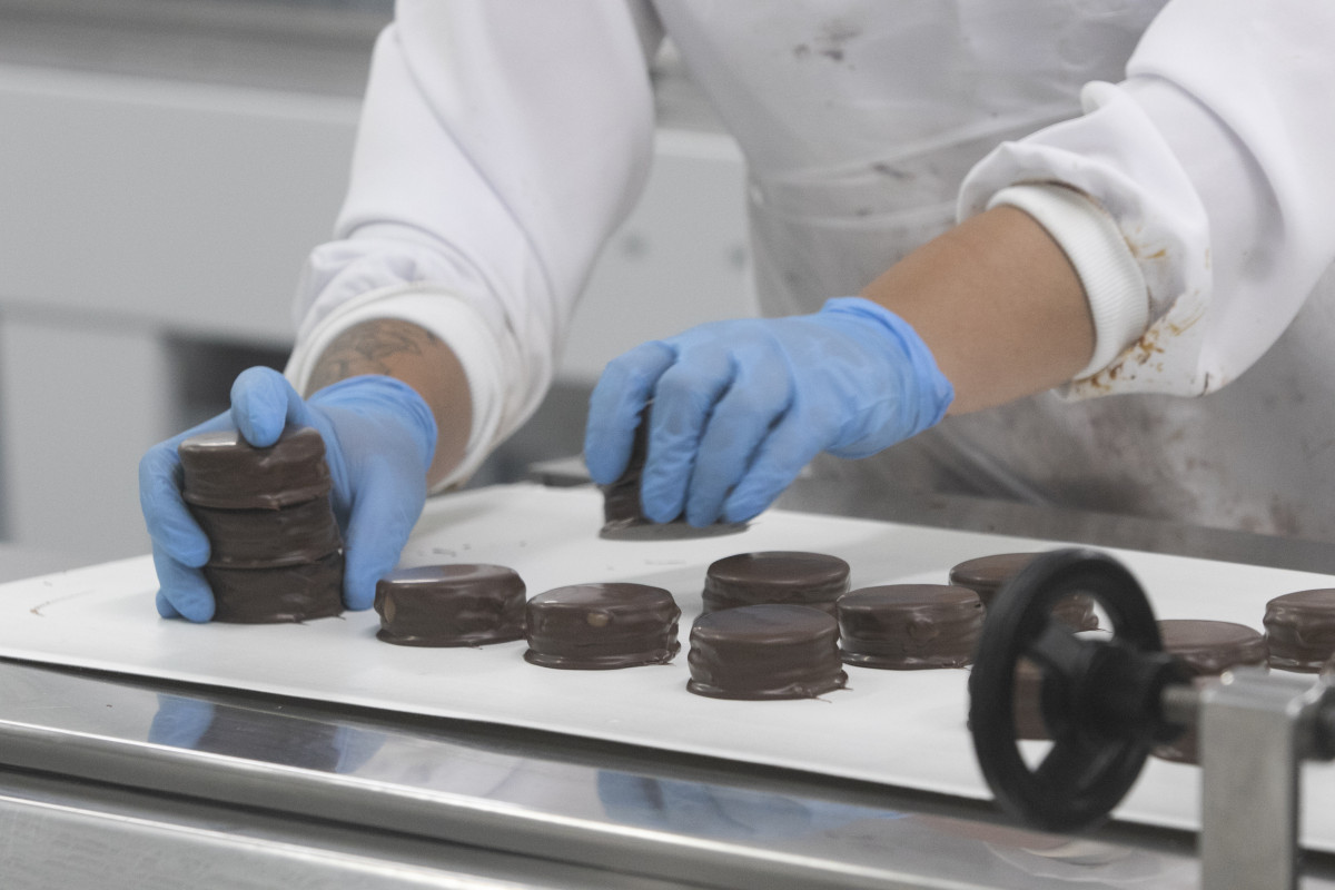 A resiliência da Odara também se reflete na equipe, que hoje conta com 60 colaboradores, sendo 35 dedicados à produção. "A produção começa com a separação das bolachas e a dosagem dos recheios, geralmente em dois níveis", explica Tiago. "Depois, os alfajores passam pelo processo de cobertura, resfriamento e embalagem”.