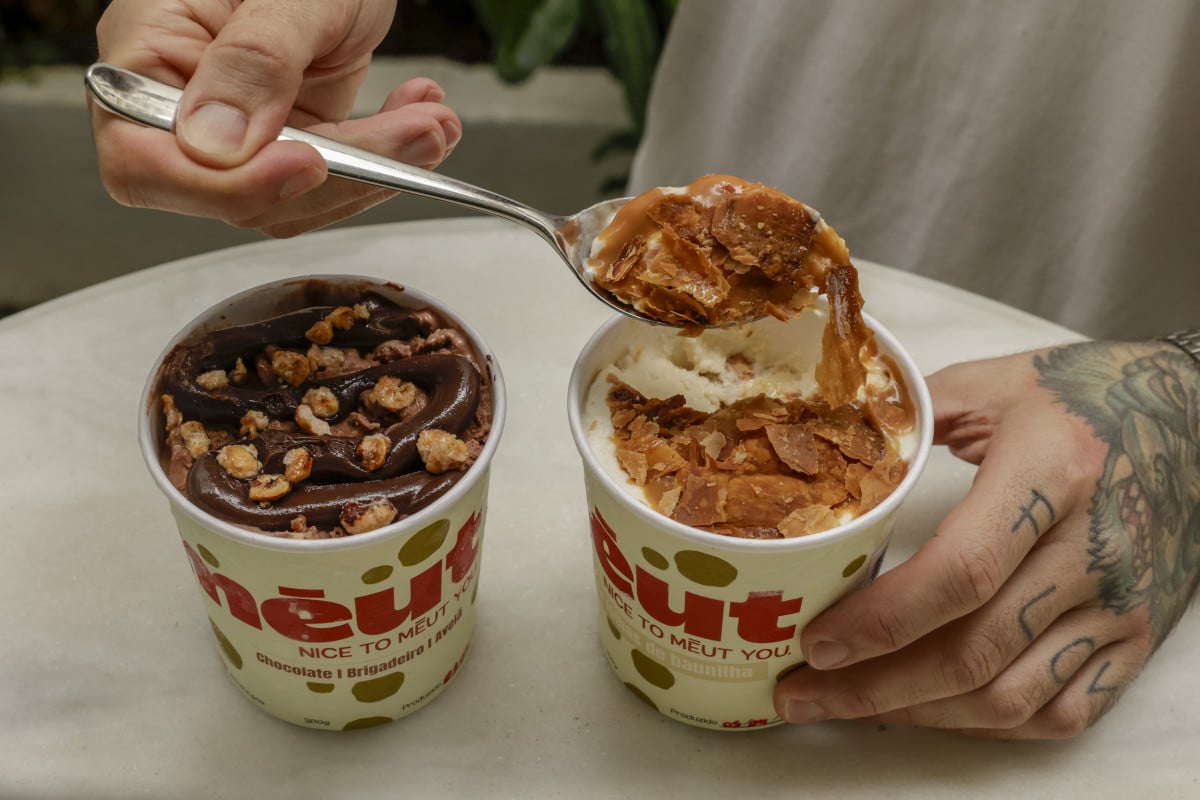 Inaugurada em 2024, a Meut é uma gelateria delivery que surgiu de uma amizade nascida na cozinha. Douglas Barcellos e Vinicius Gomes foram colegas de trabalho em outros restaurantes e decidiram unir esforços para realizar um sonho: trabalhar com gelatos. De forma literalmente caseira, iniciaram o negócio na residência de Douglas. Hoje, a dupla produz as sobremesas no espaço da cozinha do Brado, restaurante inaugurado em janeiro que tem Vinicius como sócio.