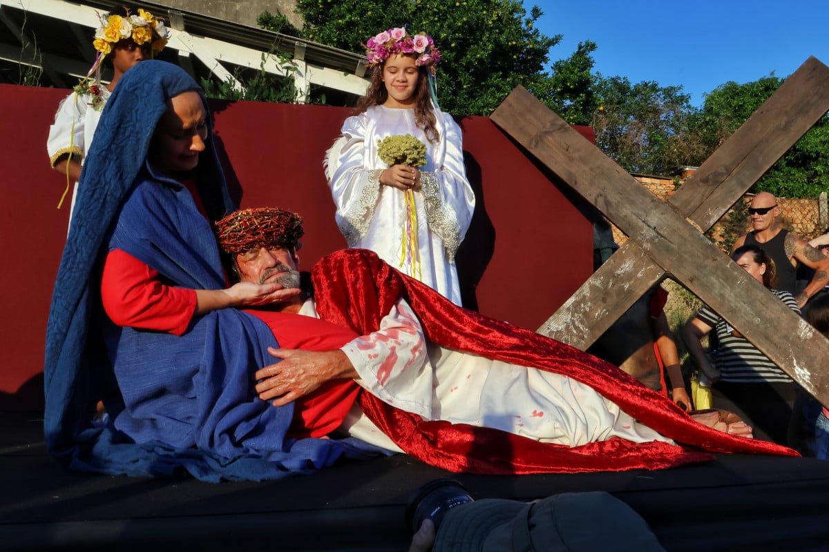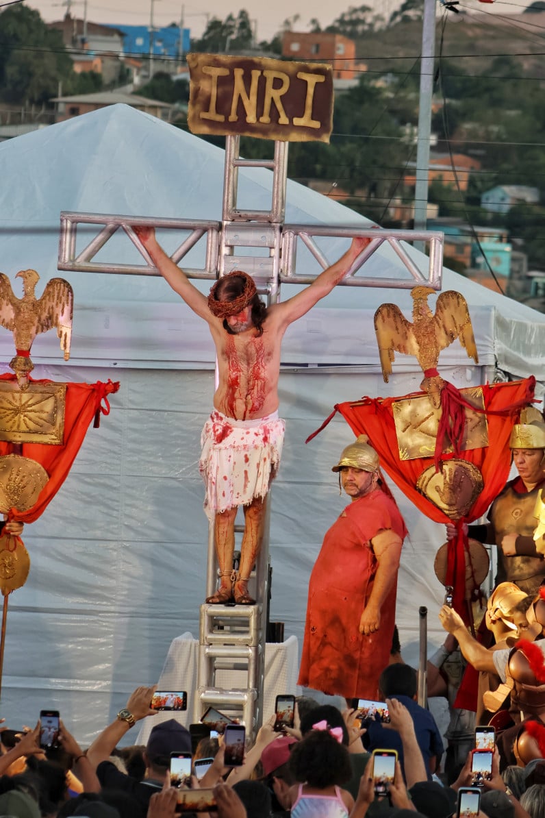 Ao final do percurso, a encenação da crucificação e a morte de Jesus antecederam a ressurreição no alto do morro. Foi o ápice do evento, aplaudido com entusiasmo pelo público.