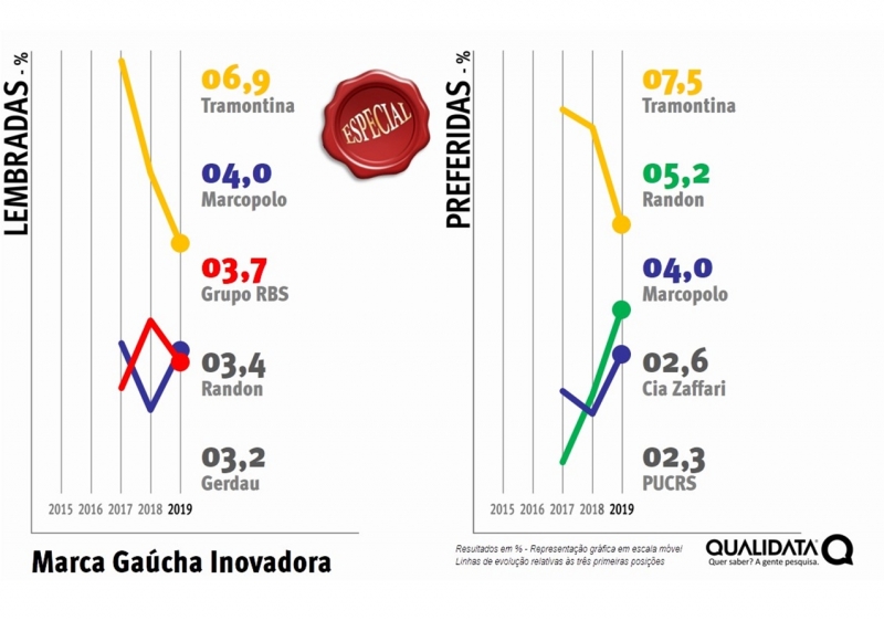 Marca Gaúcha Inovadora entrou na avaliação deste estudo em 2017. Nestes três anos, a Tramontina vem aparecendo na posição de líder. Nesta edição, foi a primeira marca lembrada por 6,9% e apontada como a preferida por 7,5% do público pesquisado pela Qualidata. Esses resultados são menores do que os obtidos pela Tramontina nos dois levantamento anteriores. Considerando os limites estatísticos deste estudo, especialmente a margem de erro admitida, pode-se entender que a Tramontina lidera, porém dentro da faixa de empate técnico com todas as demais que aparecem classificadas nas cinco primeiras posições, tanto na lembrança quanto na preferência.