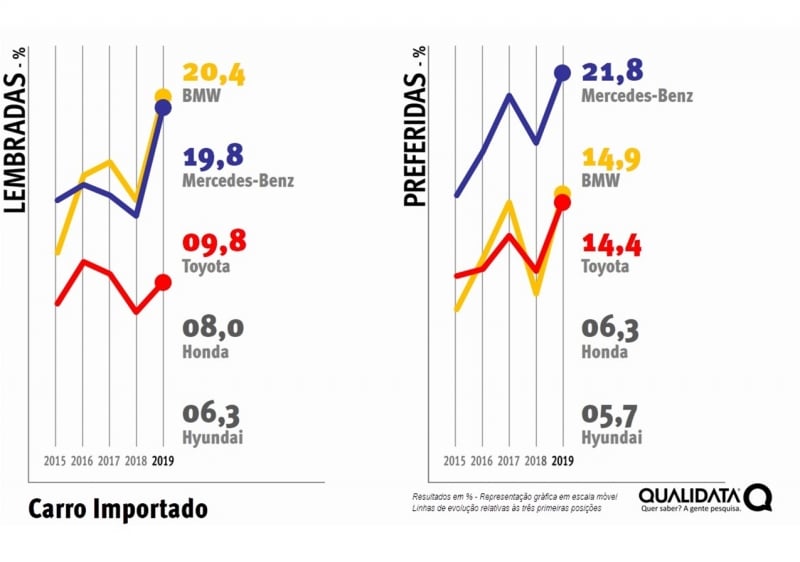 A pesquisa feita pela Qualidata mostra que a BMW consegue sustentar o primeiro lugar como marca mais lembrada em Carro Importado. Subiu de 14,5% para 20,4% e se manteve à frente nesse quesito, seguida de perto pela Mercedes-Benz, que subiu para 19,8%.