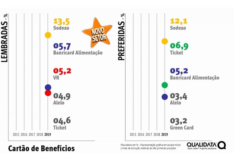 Quem surge na frente, liderando nos dois quesitos da pesquisa, é a marca Sodexo. Foi lembrada por 13,5% e apontada como a preferida por 12,1%.