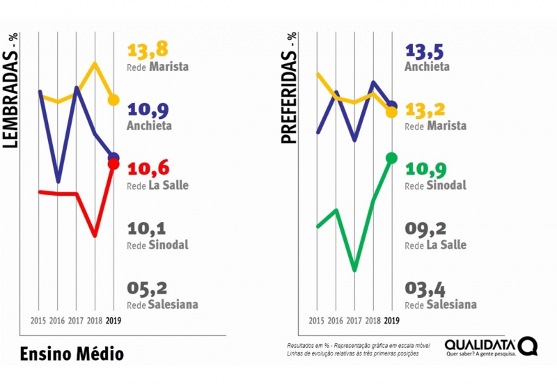 A pesquisa realizada pela Qualidata mostra que a Rede Marista segue em primeiro na lembrança, com 13,8%, ficando o Colégio Anchieta na segunda posição, com 10,9%. Na preferência é o Colégio Anchieta que defende o primeiro posto, com 13,5%, à frente da Rede Marista, que recebeu 13,2% das indicações.