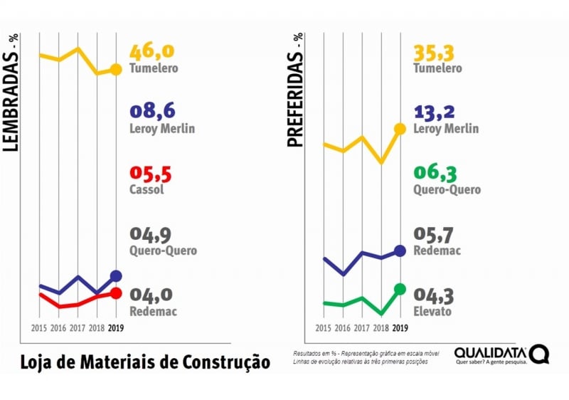 Mantendo sua condição de marca líder associada ao setor de Loja de Materiais de Construção, a Tumelero aparece agora com 46% no índice de lembrança. Uma variação de apenas 0,7 pontos percentuais em relação ao levantamento anterior, quando havia registrado 45,3% nesse quesito.