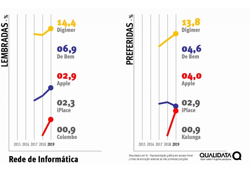 Quando o público ouvido neste estudo é perguntado sobre Rede de Informática, a pesquisa feita pela Qualidata vem mostrando que existe muita dificuldade de serem apontados nomes de redes varejistas nesse setor. Dessa vez, mais de 68% não conseguiram lembrar de nenhuma marca, chegando a 7 em cada 10 pessoas que não apontaram nenhuma rede como a preferida.