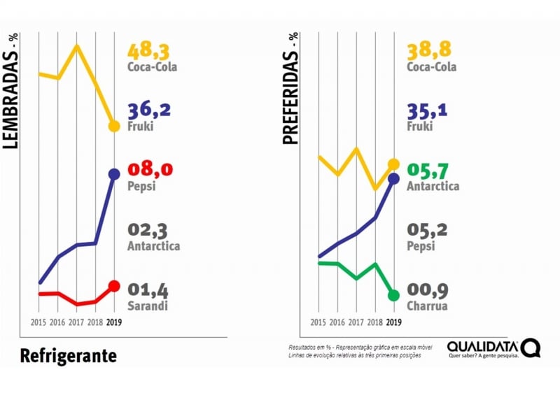 A pesquisa feita pela Qualidata revela que a diferença entre as marcas que ocupam as duas primeiras posições passa a ser de 12,1 pontos percentuais na lembrança, caindo para menos de 4 pontos percentuais na preferência.