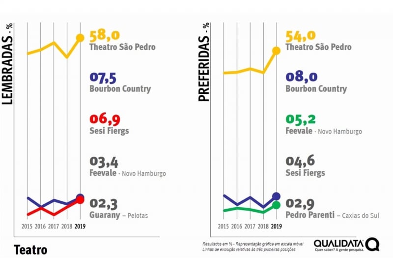Houve um bom crescimento nos índices do Theatro São Pedro, especialmente quando comparado ao desempenho dos demais nomes que aparecem na categoria Teatro. Recuperou pontos na avaliação da lembrança, passando de 51,9% para 58%. Também avançou bastante na preferência, conquistando agora 54% das indicações.