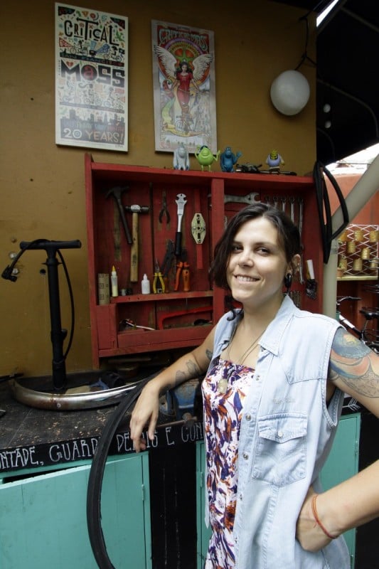 Nos fundos da loja, uma mini oficina recebe os que precisam calibrar o pneu ou ajustar uma peça. O serviço é realizado no estilo “faça você mesmo”. Ou seja: o cliente vai lá e fica à vontade para utilizar as ferramentas. O espaço não é cobrado, mas aceita colaboração.