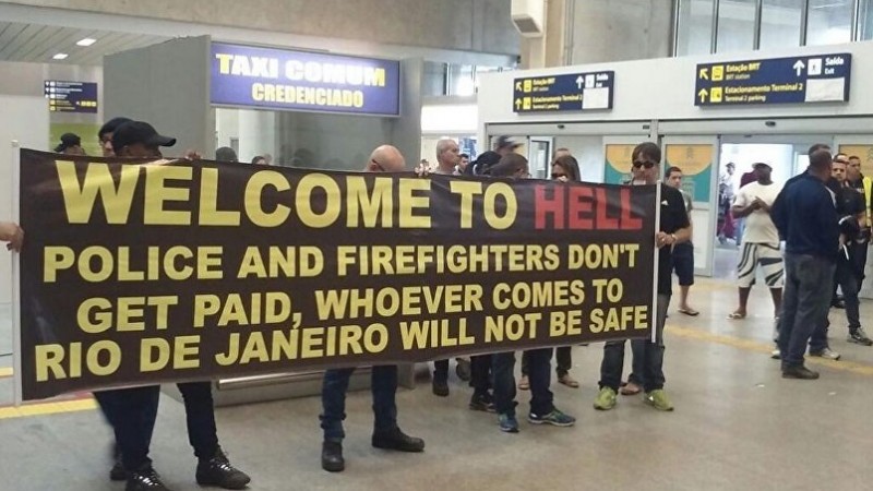 Uma faixa com a saudação em inglês Welcome to the hell (bem-vindos ao inferno, em português) foi o jeito que policiais civis e bombeiros do Rio de Janeiro encontraram para chamar a atenção de delegações estrangeiras que chegam ao Aeroporto Internacional Tom Jobim para a Rio-2016. Os visitantes desembarcam e ficam sabendo do atraso dos salários e são advertidos sobre riscos na segurança. O governo estadual prometeu quitar os salários de junho nesta terça-feira (5). "Se não pagar, vamos continuar com a faixa", avisa Cláudio Alves, assessor do Sindicato dos Policiais do Estado. No dia 12, a categoria avalia proposta de greve.