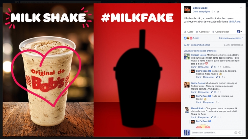 Em uma das peças publicitárias veiculadas por meio da página da marca no Facebook, o Bob's afirma: "A batida perfeita que outros procuram, o Bob's já encontrou faz tempo.", enquanto outra peça mostra duas imagens de milk shakes, uma delas apenas em sombra, sob as hashtags #milkshake e #milkfake, referindo-se à palavra em inglês "fake", que quer dizer "falso". A peça ainda vem acompanhada do texto: "Não tem textão, a questão é simples: quem conhece o sabor de verdade não toma #MilkFake." Uma terceira peça ainda faz alusão à campanha do McDonald's, que traz uma imagem da novidade e a palavra "Finalmente" ao lado. "Finalmente lá? Sempre no Bob's!", afirma.