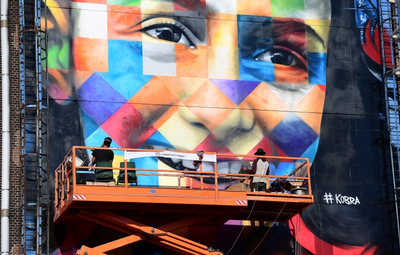 Artista Eduardo Kobra trabalha em grafite retratando Anne Frank