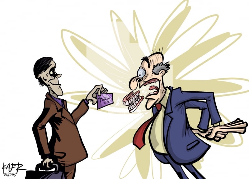 Para surpresa do advogado-aprendiz de político, o homem busca na pasta uma terceira dentadura.