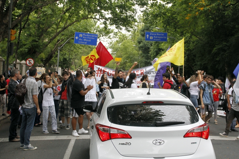 O confronto na rua Luiz Englert, próximo ao Salão de Atos da Ufrgs, foi o mais tenso, com o uso de bombas de gás e a resposta de alguns manifestantes, que lançaram pedras e pedaços de galho de árvore. Uma das bombas caiu em meio a um grupo que corria para dentro do campus. Muitos estudantes ostentavam olhos lacrimejantes devido ao efeito do gás. No último bloqueio, motoristas que estavam no brete do protesto aceleraram os carros e saíram. Um único agente da EPTC que tentava coordenar o fluxo quase foi atropelado.