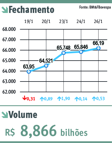 A Bovespa teve, nesta quinta-feira, sua quarta sessão de alta consecutiva e atingiu novo pico no ano. O bom desempenho das ações do setor financeiro absorveu movimentos de correção em ações ligadas a commodities, e o Índice Bovespa subiu 0,53%, aos 66.190 pontos, maior nível desde 26 de março de 2012. O volume de negócios totalizou R$ 8,9 bilhões.