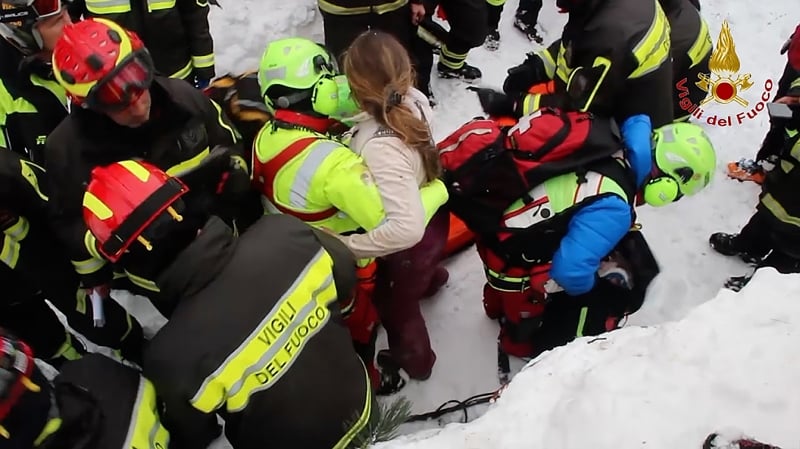 Uma forte avalanche atingiu um hotel localizado em uma estação de esqui na cidade de Farindola, em Abruzzo, no centro da Itália. O acidente aconteceu na noite de quarta-feira (18), depois da região ter sido atingida por pelo menos três terremotos com magnitude superior a 5. Pelo menos 30 pessoas estariam no hotel no momento da avalanche. Na sexta-feira (20), oito pessoas já haviam sido encontradas com vida pelas equipes de resgate e três corpos foram retirados dos escombros. O socorro demorou a chegar ao local porque as vias de acesso estavam bloqueadas pela neve. O hotel Rigopiano, no pé das montanhas do Gran Sasso, foi totalmente destruído.