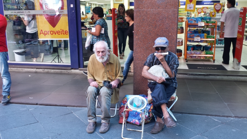 Eles não têm mais sonhos para sonhar, nem mesmo para fantasiar. Prematuramente envelhecidos, com 64 e 68 anos, vieram "lá da Serra" porque perderam a casa. A gaita de boca emite farrapos de harmonias, e o improvisado pandeiro não guarda nenhum ritmo, apenas o bater sincopado acompanhando o parceiro. Acomodados em banquinhos no calçadão da Rua da Praia, à espera de migalhas de moedas, restam-lhes apenas cacos de dor de uma dignidade evaporada há muito tempo, à espera do amargo fim.