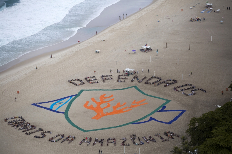 A ONG Greenpeace realizou, na última quarta-feira (29), uma intervenção artística na Praia de Copacabana assinada pelo artista norte-americano John Quigley. A mensagem e o desenho, formados por pessoas e tecidos, só foram vistos do céu. Estudantes de quatro escolas públicas e voluntários participaram da manifestação. A ação é parte da campanha “Defenda os corais da Amazônia”, que celebra a descoberta de corais perto do encontro entre o Rio Amazonas e o mar e alerta para a importância de preservar o ambiente. Segundo a ONG, empresas estrangeiras querem perfurar a localidade em busca de petróleo.