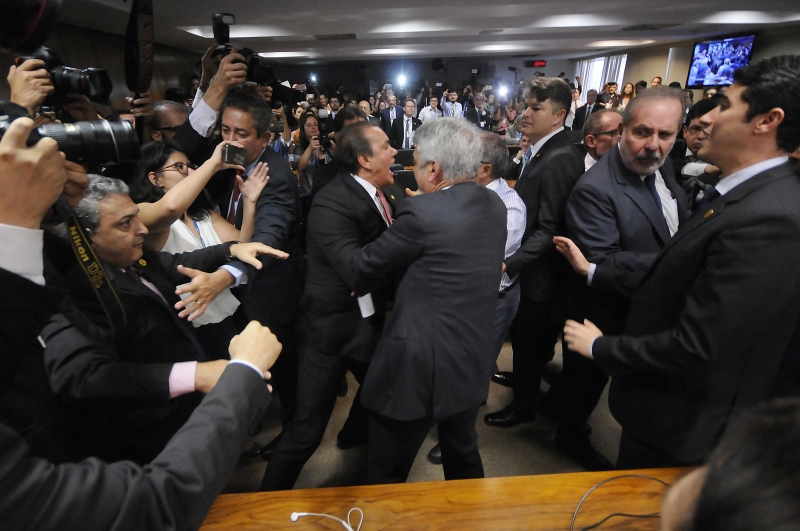 Uma confusão entre senadores suspende a sessão da Comissão de Assuntos Econômico (CAE) em que seria lido o parecer do relator da reforma da Trabalhista, Ricardo Ferraço (PSDB-ES) na última terça-feira (23). O conflito começou depois que a oposição perdeu por dois votos (13 a 11) uma questão de ordem apresentada pelo senador Randolfe Rodrigues (Rede-AP) para adiar a leitura. Ele disse que um relatório não poderia ser lido sem que tenha sido levado a conhecimento da Casa com o intervalo de, no mínimo, duas sessões. Incitados pela plateia contrária à reforma, os senadores da oposição protestaram contra a leitura iniciando um bate-boca com os parlamentares da base. Irritados, os senadores Randolfe Rodrigues e Ataídes Oliveira (PSDB-TO) quase chegaram ao confronto físico e tiveram que ser separados por outros parlamentares e pela segurança da Casa.