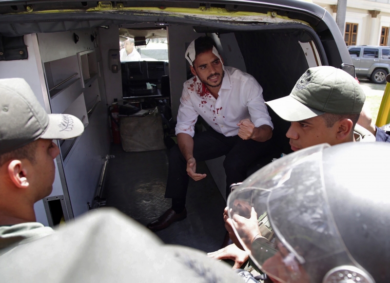 Um grupo de apoiadores do presidente da Venezuela, Nicolás Maduro, entrou, na última quarta-feira (5), na sede do Parlamento, que é controlado pela oposição. Deputados, seguranças e jornalistas ficaram feridos na ação. Os grupos cercaram o prédio e os deputados ficaram presos no local. A ocupação durou cerca de nove horas e o local só foi liberado de noite. Os deputados Nora Bracho, Armando Armas (no centro da foto), Américo De Grazia, Luis Padilla e José Regnault Hernández, todos da oposição foram socorridos na enfermaria, com ferimentos consideráveis. De Grazia, o mais atingido, foi levado por uma ambulância a uma clínica na região noroeste de Caracas, onde sofreu uma convulsão. Ao mesmo tempo do ataque, todo o sistema de rádio e televisão do país transmitia o desfile com que as Forças Armadas tradicionalmente homenageiam a data nacional na capital venezuelana. O evento contou com a presença do presidente Nicolás Maduro e membros de seu Governo.