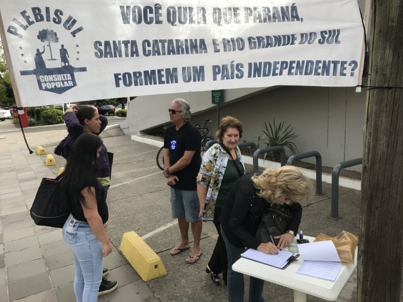 Uma consulta informal sobre a separação dos três estados do Sul do Brasil ocorreu neste sábado (7) em quase mil municípios da região, de acordo com o movimento O Sul é o Meu País, organizador da iniciativa. No domingo (8), o site do Plebisul indicava que 96% dos votos eram a favor do movimento, somando 330 mil pessoas. Os contrários somavam 13,3 mil votos. O movimento buscava atrair 2 milhões de eleitores e chegou a ter fila em uma das urnas depositada em Porto Alegre. A consulta é o segundo plebiscito em 12 meses sobre o separatismo. No primeiro, em outubro de 2016, o 'sim' venceu com 96% dos votos. A consulta não tem validade, pois não é registrada na Justiça Eleitoral e descumpre preceitos da Constituição brasileira. A coordenação do movimento diz que a intenção é fomentar o debate da proposta. O maior argumento em prol da separação é que a região Sul gera riquezas que são distribuídas com desigualdades no retorno aos estados. Na Capital, foram quase 40 pontos de captação de votos.