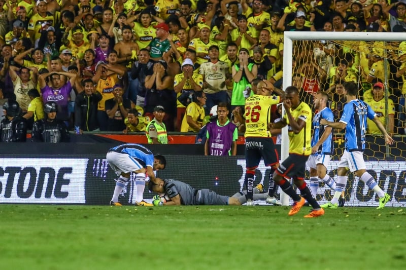 O Grêmio conquistou uma sólida vitória contra o Barcelona de Guayaquil (EQU), na noite desta quarta-feira (25) e encaminhou sua vaga para a final da Libertadores da América de 2017. E mesmo com a precisão ofensiva do tricolor, o grande assunto após a partida foi o goleiro Marcelo Grohe. Isso porque, no início do segundo tempo, o arqueiro fez uma defesa surpreendente, em chute à queima-roupa do centroavante Ariel. Em lançamento para a área gremista, a bola sobrou para o atacante do Barcelona a poucos metros da goleira. Ariel finalizou com força de perna esquerda e Grohe conseguiu evitar o gol ao esticar o pulso direito e bloquear a trajetória da bola, para incredulidade da torcida equatoriana (foto). A defesa também repercutiu na imprensa internacional: o jornal britânico The Sun chamou o lance de “maior defesa da história”, enquanto o argentino La Nación disse que a jogada “levou todas as exclamações de admiração” do estádio.
