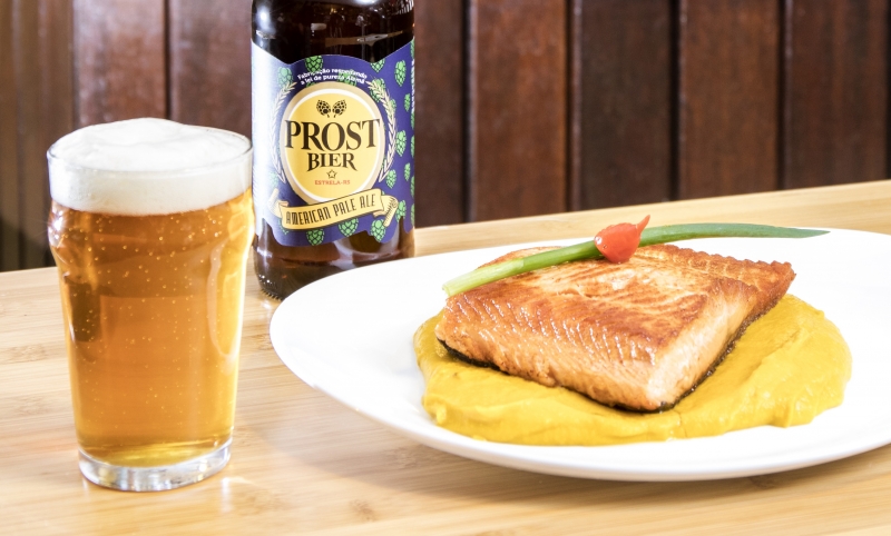 Homem na cozinha: salmão grelhado com purê de abóbora cabotiá