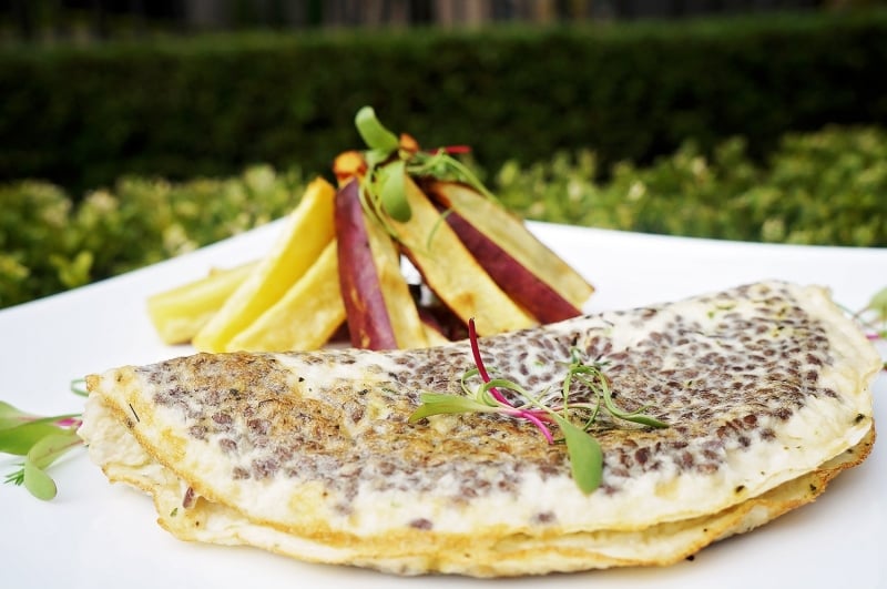5. Com o auxílio de uma espátula, soltar as bordas da omelete e virar o lado. Deixar no fogo mais três minutos, sobrar ao meio, em formato de meia-lua. E é só servir.