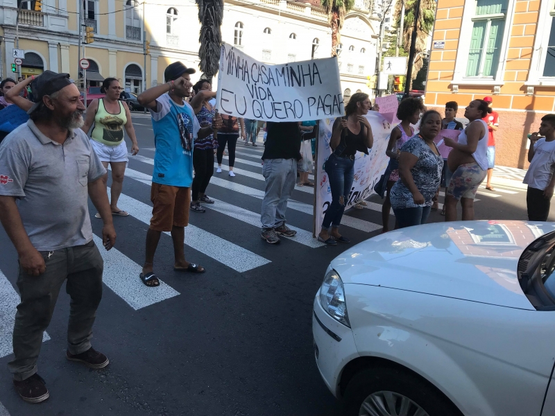 Ocupantes de um residencial da zona Norte de Porto Alegre realizam, na tarde desta sexta-feira (2), um protesto no Centro de Porto Alegre, ao lado do Paço Municipal. Homens, mulheres, jovens e crianças já vinham realizado manifestação desde a manhã e, agora à tarde, fazem ato se posicionando sobre a faixa de segurança cada vez que a sinaleira fecha, ao lado da prefeitura.