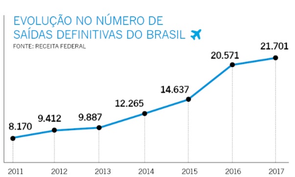 Nos últimos seis anos, o número de declarações de saída definitivas do Brasil junto à Receita Federal quase triplicou, segundo o órgão. Enquanto, em 2011, 8,1 mil pessoas buscaram outros países como residência; no ano passado, o total subiu para quase 22 mil. Na avaliação de especialistas em expatriação, a crise financeira e de segurança pública tem influenciado nesse movimento. Por esse contexto, os vistos de permanência no exterior mais procurados são aqueles que, a partir de um investimento, permitem receber os direitos de um cidadão natural.