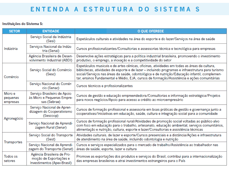 Composto por nove entidades corporativas (Sesi, Senai, Sesc, Senac, Sest, Senat, Senar, Sescoop e Sebrae) e duas agências de fomento (ABDI e Apex), o Sistema S corre o risco de diminuir a oferta de ensino, cursos profissionalizantes e oportunidades de lazer e cultura para, aproximadamente, 12 milhões de pessoas em todo o País.