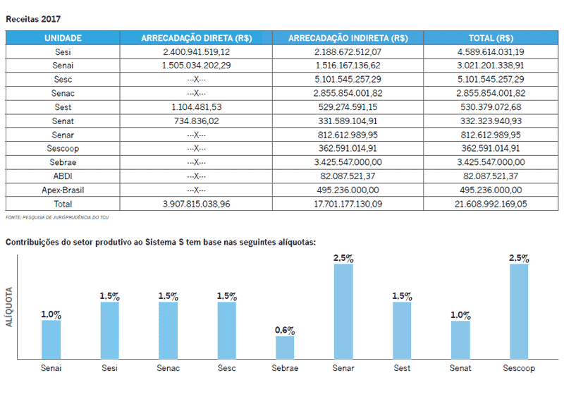 Como essa contribuição é embutida pelas empresas no preço de seus produtos, ela é repassada ao consumidor. Por isso, também, pode ser considerada um recurso público, o que justifica a gratuidade em muitos cursos técnicos, atividades culturais e serviços de educação ofertados pelos serviços sociais autônomos. Em 2017, o valor total da receita orçamentária, via arrecadação indireta, das 11 entidades que formam o sistema, foi de R$ 17 bilhões.