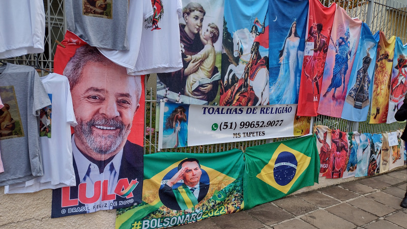 A festa na Igreja de Santo Antônio, em Porto Alegre, na segunda-feira, celebrou o santo casamenteiro. Mas a política se misturou com a religião do lado de fora. O sincretismo incluiu bancas vendendo camisetas com imagens religiosas, doces, flores, imagens, pulseiras, rosários... mas também teve quem vendesse peças com estampas dos dois candidatos ao Planalto que polarizam a disputa, o ex-presidente Lula (PT) e o presidente Jair Bolsonaro (PL). Por sinal, no Centro da Capital também há ambulantes comercializando materiais dos dois políticos.