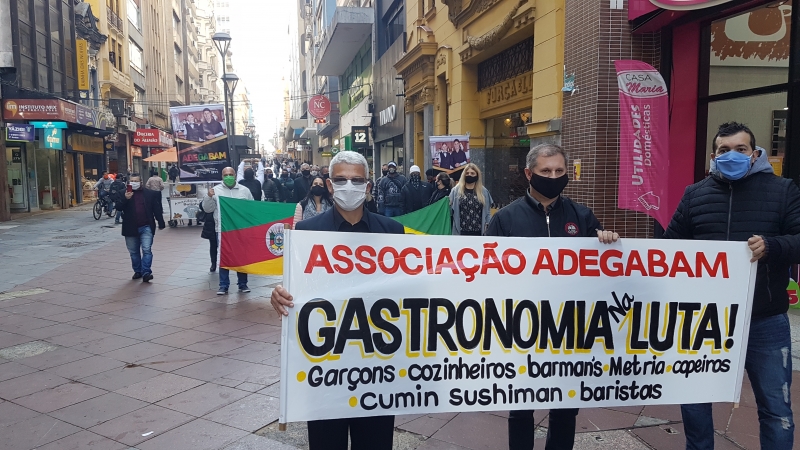 Uma pequena multidão de profissionais ligados à gastronomia chamou atenção na Rua da Praia ontem. Como se observa na faixa, vai a uma dezena o número de profissionais que quer voltar a trabalhar em Porto Alegre. No caso dos barman e garçons, é pior ainda, porque a maioria depende de comissões e gorjetas. A desesperança campeia.