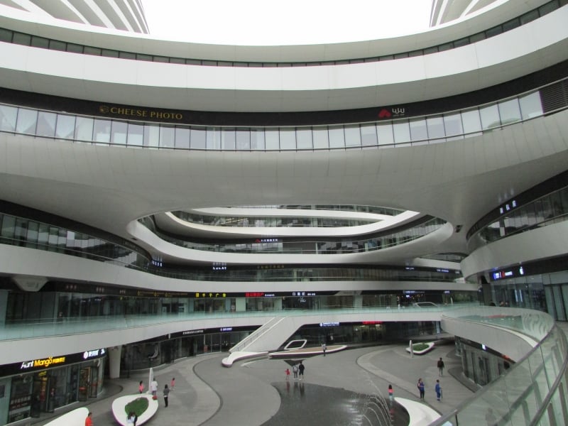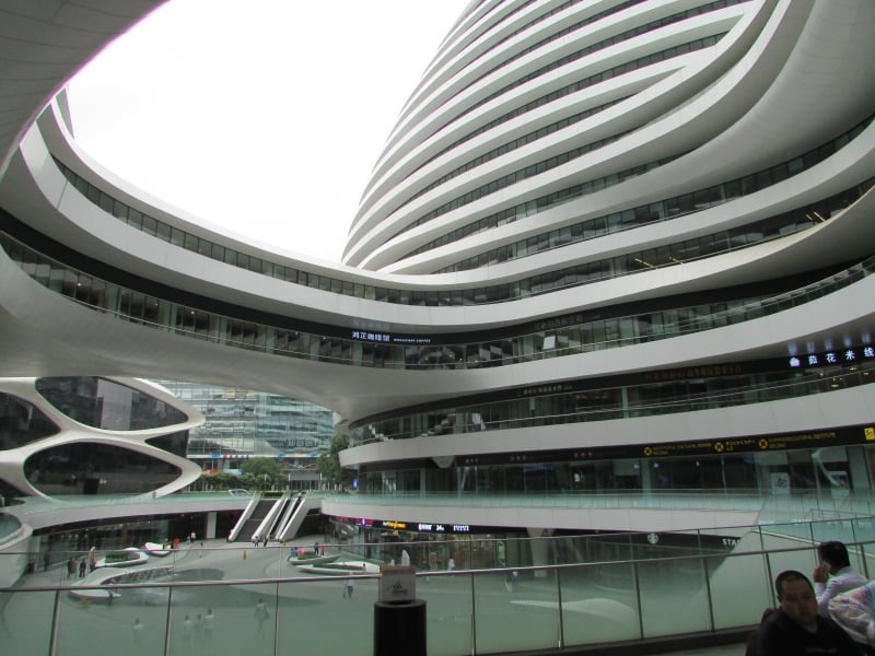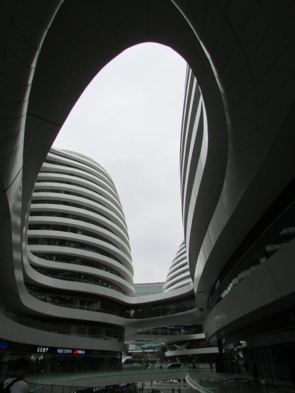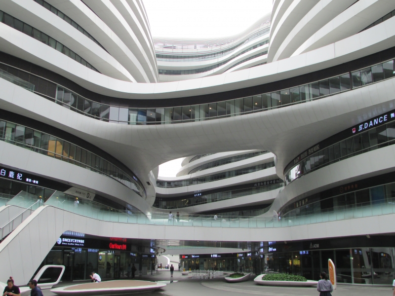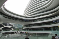 Pequim não é aquele deslumbre tecnológico e arquitetônico que marcam Tóquio, no Japão, por exemplo, mas tem lá seu atrativos e construções que também impressionam. Um deles é o Galaxy Soho. O complexo comercial e de escritórios tem 330 mil metros quadrados. Ou seriam 330 mil metros redondos? Isso porque o complexo é formado por cinco prédios distintos, curvos, e interligados por passarelas.