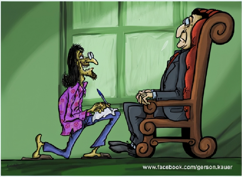 - Eu sentado na sala de reuniões do principal hotel da cidade, esperando um jornalista de escol. Então entra um sujeito cabeludo, calçados rotos, barba por fazer, sem gravata nem paletó. Ele tira uma esferográfica presa na orelha, pega um papel amassado do bolso e se ajoelha na minha frente!...