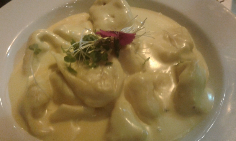 Enquanto isso, eu examinava um cardápio criado para o Dia Mundial da Massa, comemorado exatamente naquele 25 de outubro: escolhia-se uma massa e um molho, por um preço promocional. Não resisti ao Tortelonne recheado com damasco e Brie, ao molho bechamel com noz moscada, cravo, açafrão, suco e raspas de limão siciliano (R$ 46,00). Uma preciosidade o molho, a massa al dente, recheio saborosíssimo.