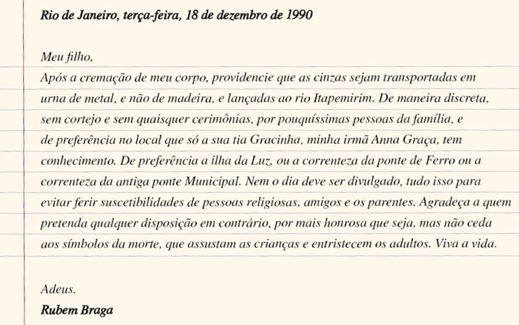 Na véspera do dia em que morreria, abatido por um câncer de laringe, Rubem Braga escreveu ao seu único filho, o jornalista carioca Roberto Seljian Braga (1937-2017), uma carta que sintetiza seu estilo seco, sóbrio, solenemente simples.