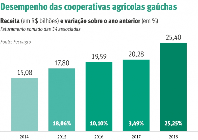A soja que os produtores gaúchos estocaram no ciclo 2016/2017, devido aos baixos preços, e que foi vendida em 2018 ajudaram as 34 cooperativas gaúchas filiadas à Fecoagro a alcançar um faturamento total de R$ 25,4 bilhões no ano passado. O valor foi 25,25% maior do que os R$ 20,29 bilhões do fechamento de 2017. O agricultor que estava melhor capitalizado segurou a venda, mantendo o grão estocando em maior volume nas cooperativas para comercialização posterior, elevando significativamente os negócios no ano passado.